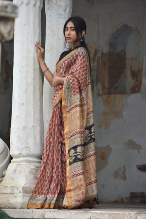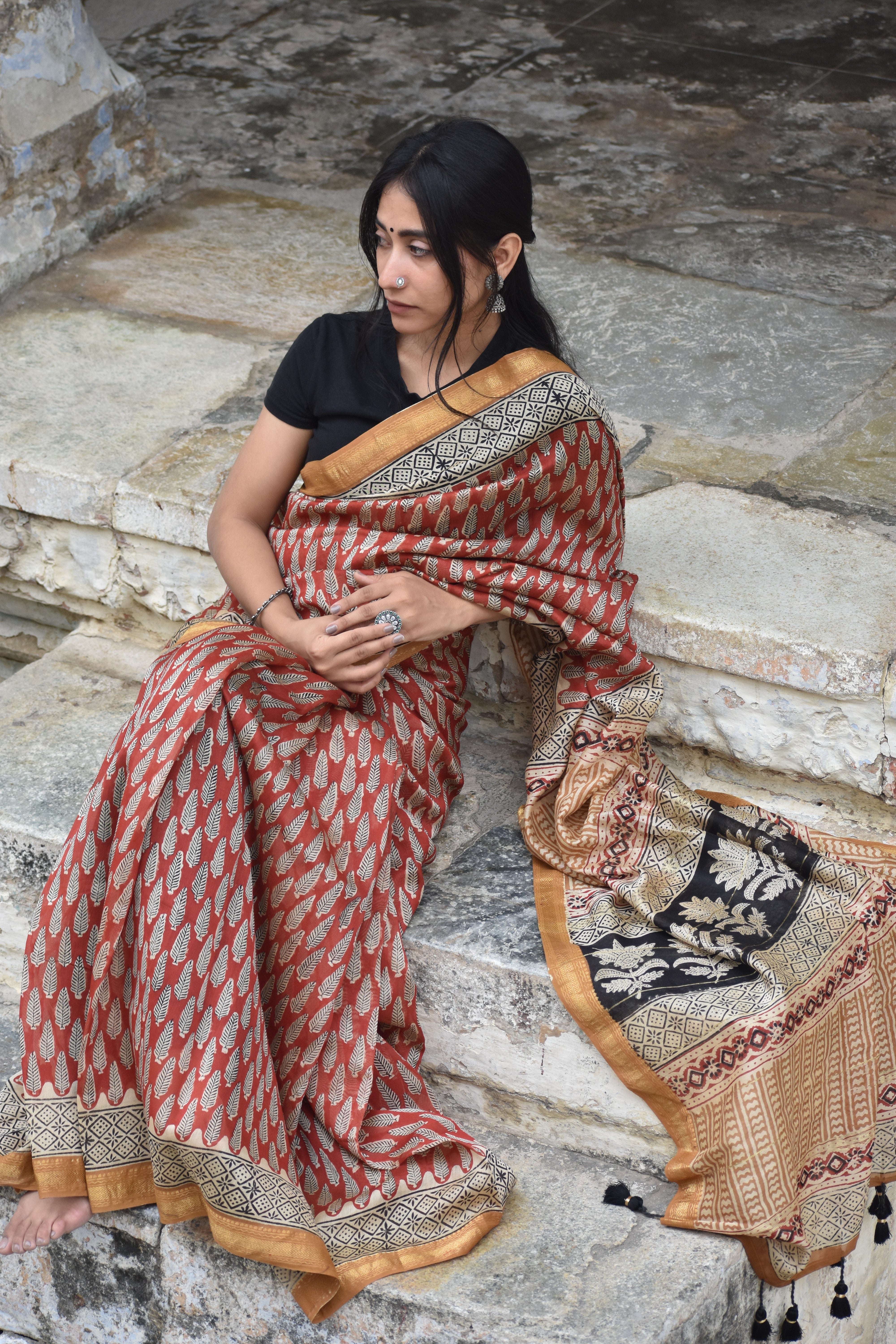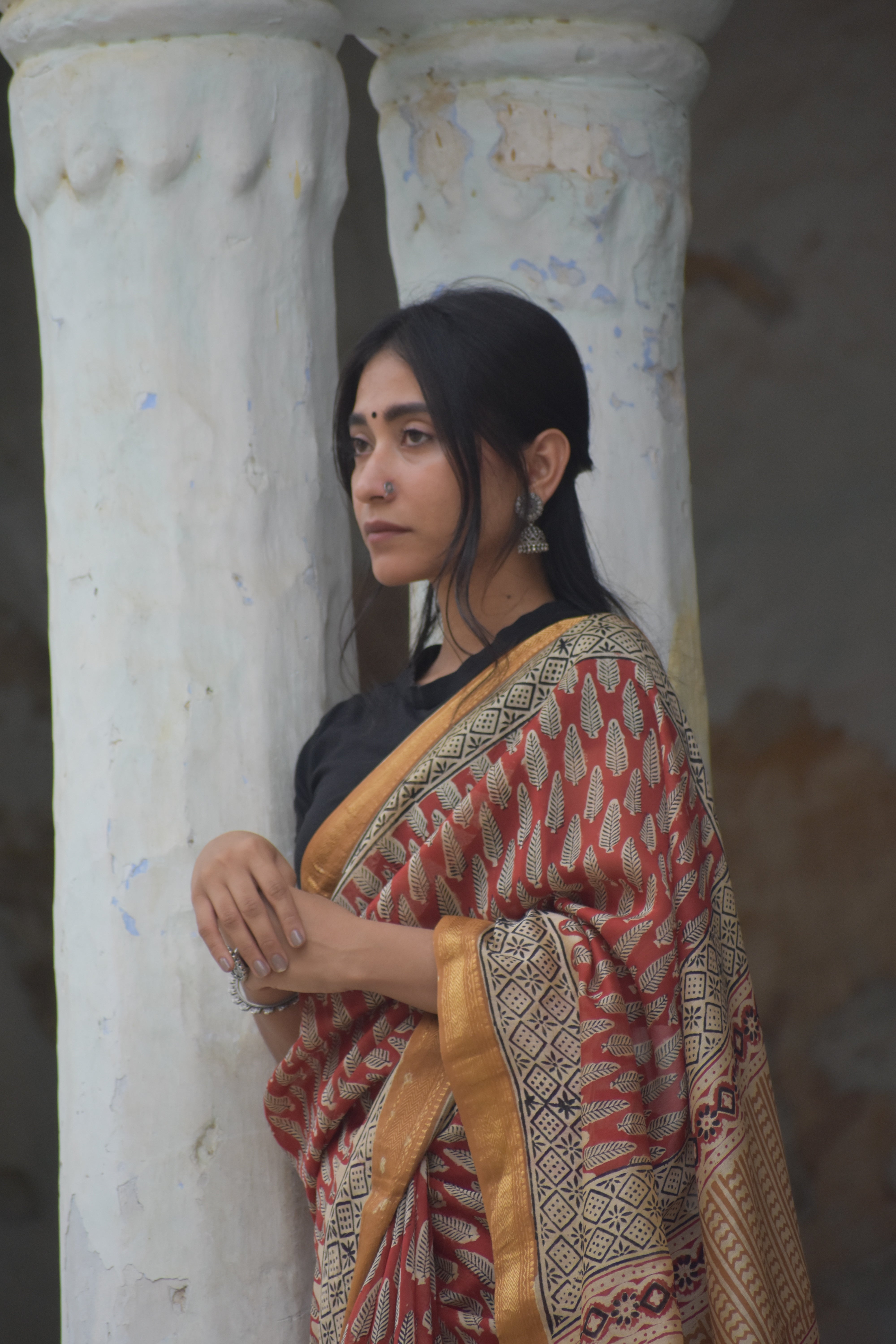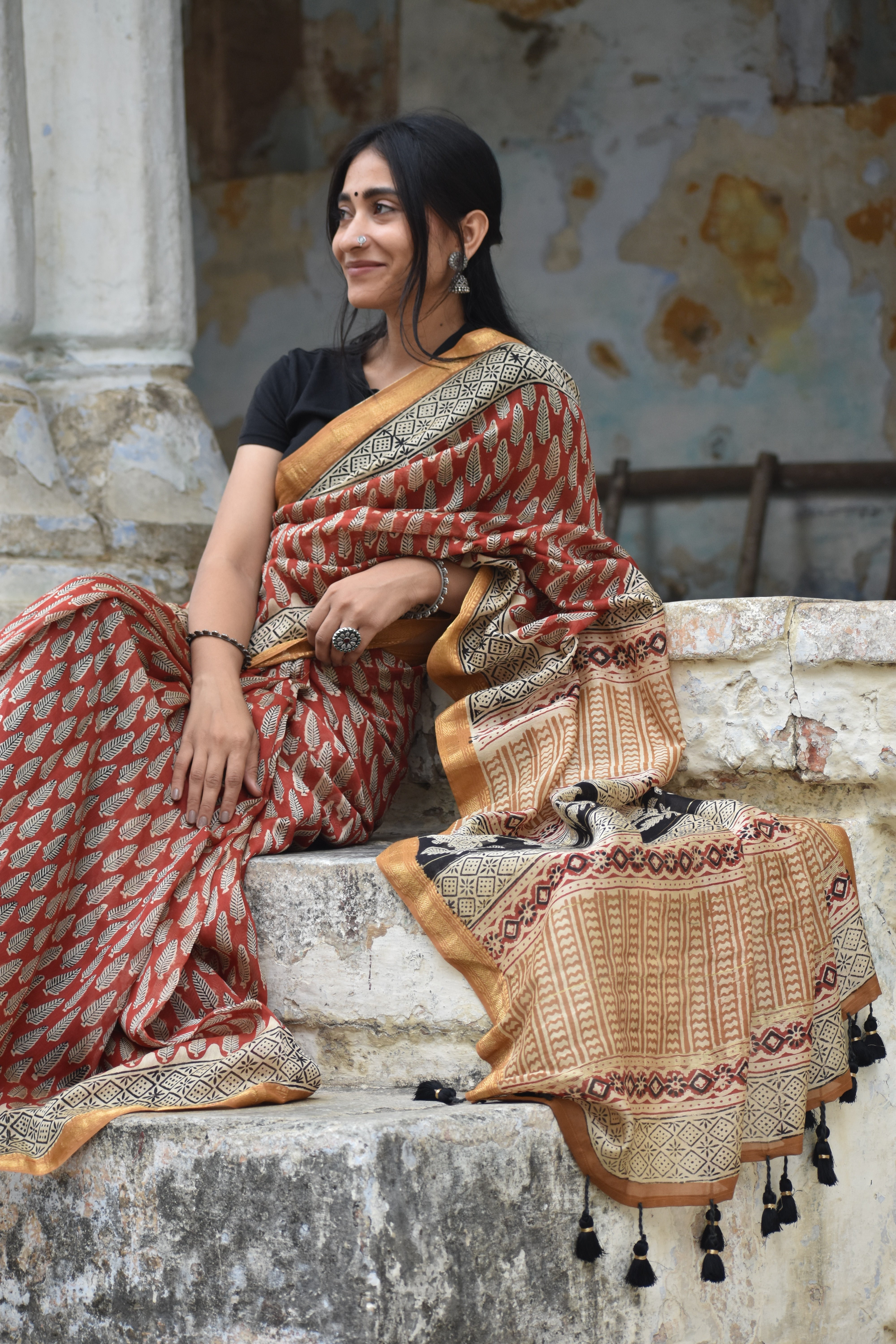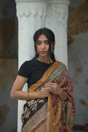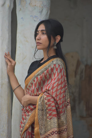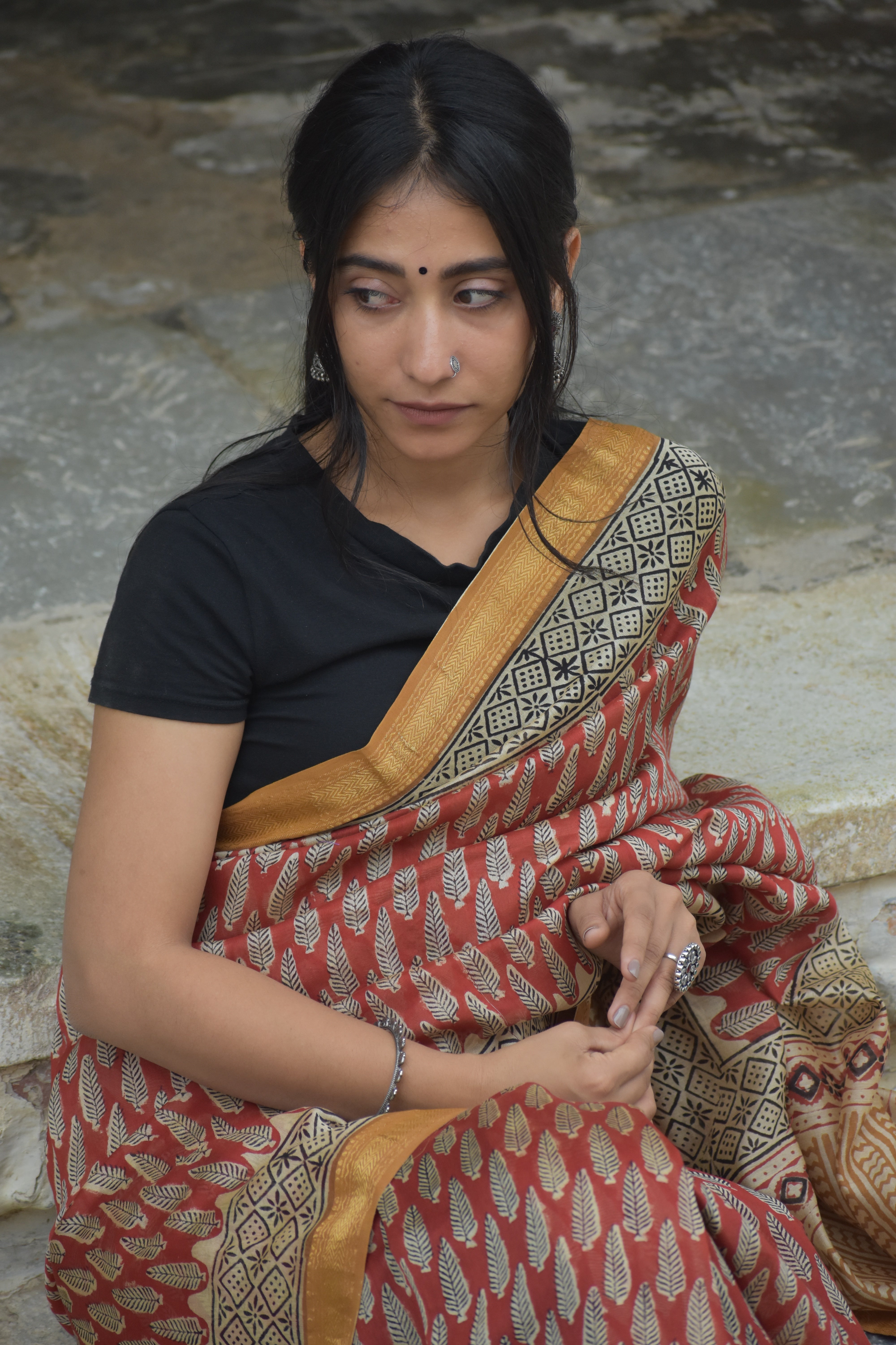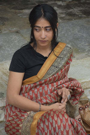 "Gudhal" Maheshwari cotton silk saree blends traditional elegance with contemporary charm. Crafted meticulously, it features a delicate interplay of cotton and silk threads, ensuring a luxurious yet lightweight feel. The saree is adorned with intricate 'buti' motifs and a contrasting border that adds a touch of sophistication. The pallu showcases a mesmerizing blend of floral patterns inspired by the Gudhal flower, rendered in vibrant hues that exude grace and allure. Perfect for both formal occasions and casual gatherings, "Gudhal" embodies timeless beauty and cultural richness, making it a prized addition to any wardrobe seeking classic sophistication with a modern twist.