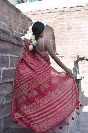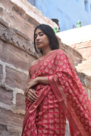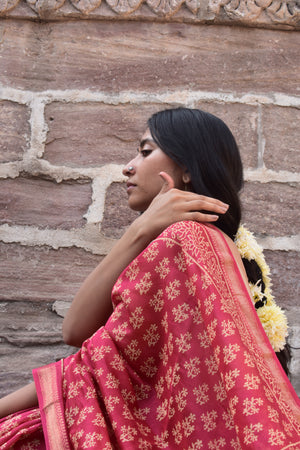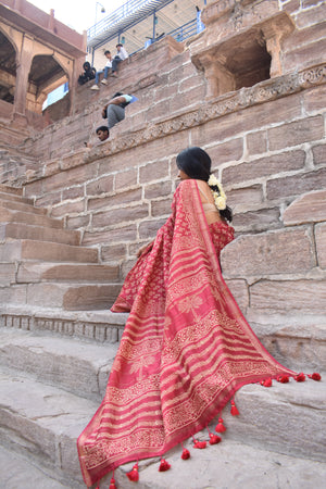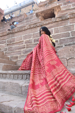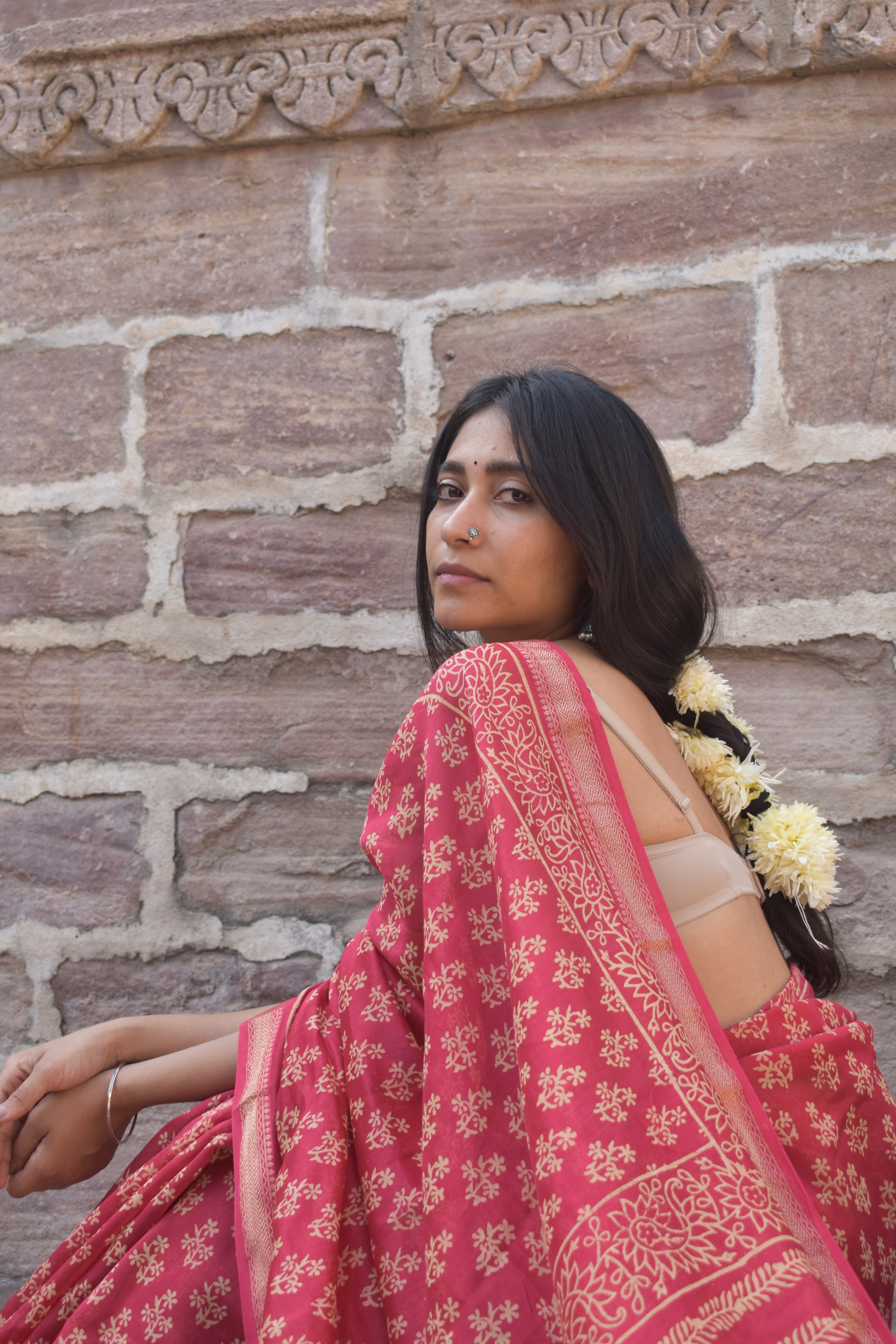 Inspired by the purity and grace of the lotus flower, the Kamal Saree is a tribute to feminine beauty and strength. Crafted from luxurious Maheshwari cotton silk, it features a mesmerizing weave of lotus motifs and paisley patterns, meticulously adorned with gold and silver zari work. The Kamal Saree promises elegance and sophistication, making it an ideal choice for weddings, festivities, or cultural celebrations where you want to stand out with grace and poise.