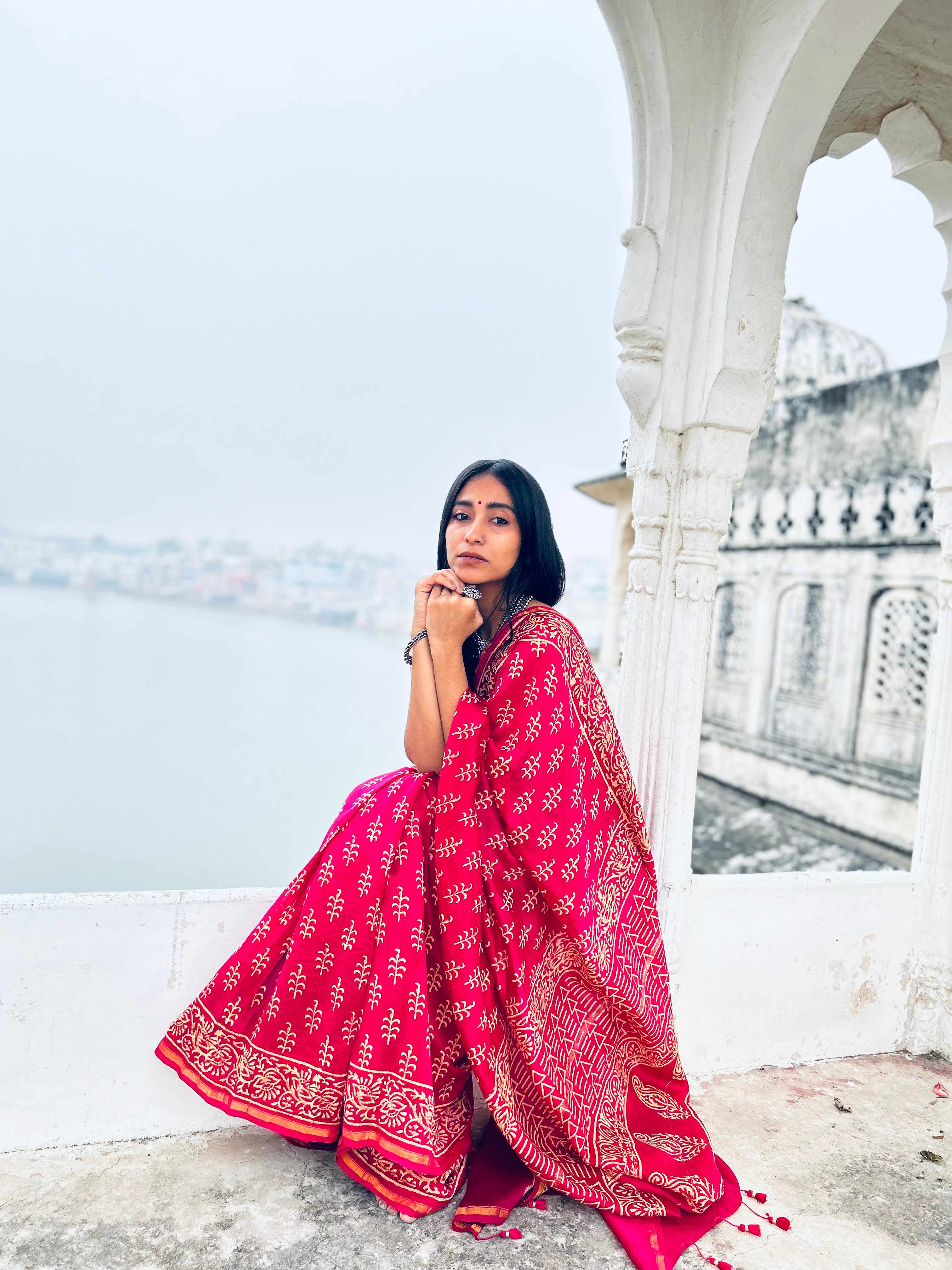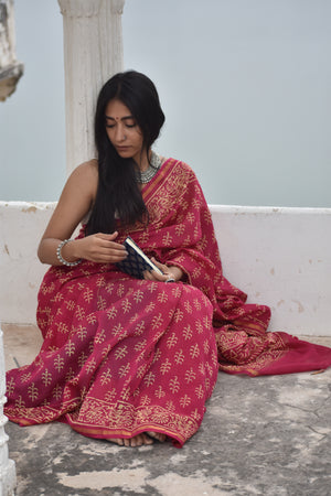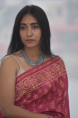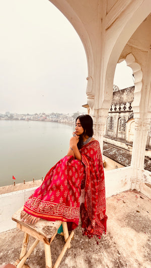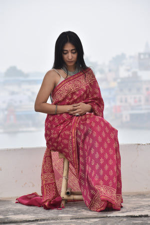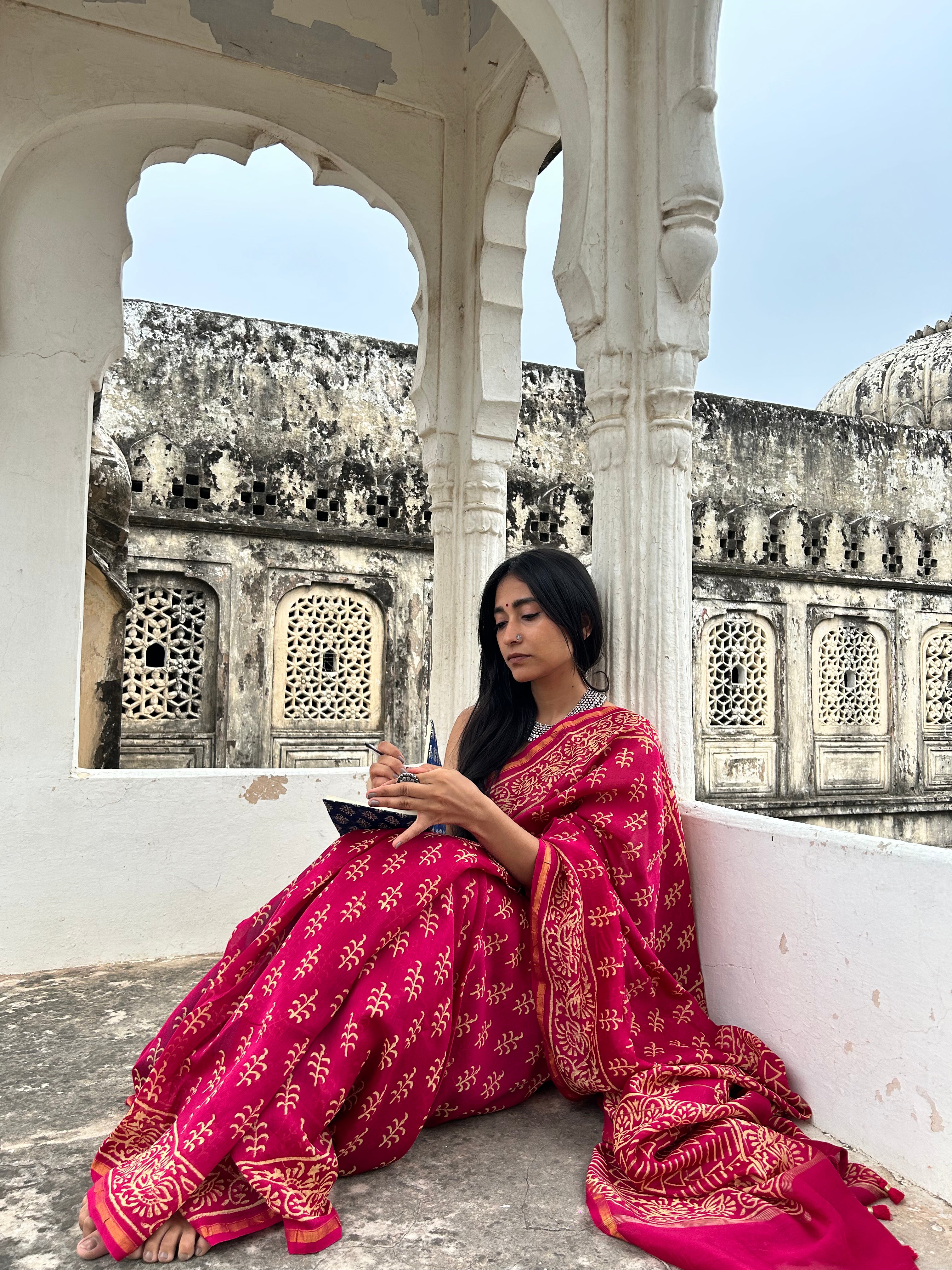 Elevate your wardrobe with the Kaner Saree, a masterpiece of Chanderi cotton silk artistry. Adorned with intricate Kaner flower motifs in vibrant hues and shimmering zari work, this saree is a testament to craftsmanship and elegance. Whether it's a festive celebration or a formal gathering, the Kaner Saree ensures you stand out with its impeccable craftsmanship and timeless appeal.
